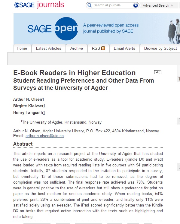 For et par dager siden kunne Arthur N. Olsen, Henry Langseth og jeg fastslå "at vi fått publisert en artikkel i et internasjonalt tidsskrift. Som gode bibliotekarer er det i et tidsskrift med åpen tilgang. Les selv: E-Book Readers in Higher Education.